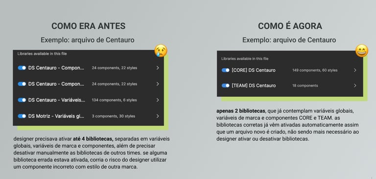 One of the major complaints from users was the excessive number of Figma libraries. For instance, a designer working in the Centauro tribe had to manually activate up to 4 libraries to access the necessary material for building their prototypes.