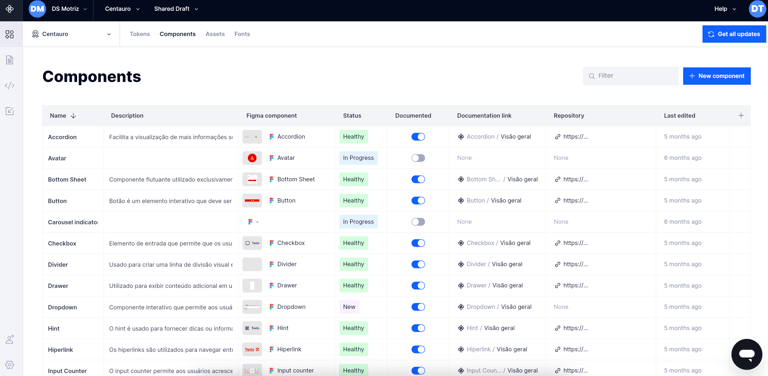 Additionally, the new tool streamlined component management through a table where it's possible to add a description, Figma link, status, documentation status, link to the page, link to the engineering repository, modification date, and more. It also allows managing design tokens, assets, and typography fonts.